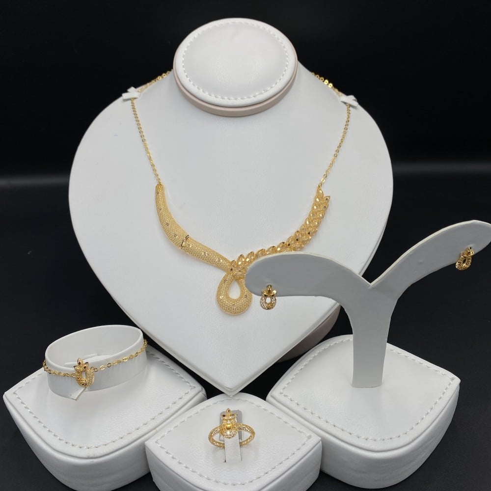 The set consists of a delightful array of harmonious pieces, including a ring that highlights the beauty of your fingers, earrings that add a touch of charm to your face, a necklace that adorns your chest with incomparable elegance, and a bracelet that adorns your wrist with a touch of luxurious elegance.
