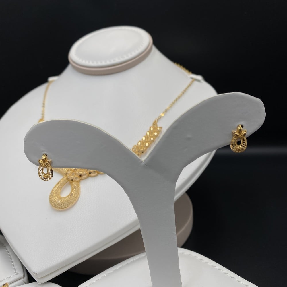 In short, this 21-karat gold set, weighing 14.32 grams, is a unique and elegant piece that adds a touch of charm and beauty to your look. You'll feel confident and radiant wearing it, and you'll be the center of attention with your elegance and femininity. It's a great investment in a piece that catches the eye and continues to add a touch of luxury to your jewelry.